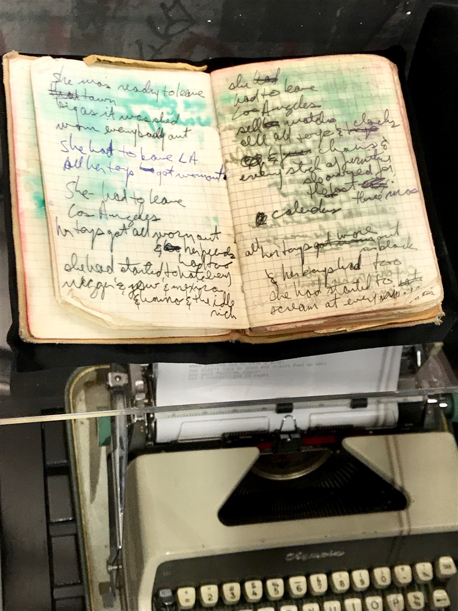 Although I adored seeing DJ Bonebrake’s drum kit and a quite iconic blue polka dot dress worn by Exene in well known photos, it was a few more obscure items that impressed me the most. John explained that a portable typewriter, hauled around with the band and used to write lyrics, was bought on Santa Monica Blvd, just west of Fairfax. But it was a small ink-smeared notebook, with edges tattered and frayed, that was my favorite item. A journal of poetry that John Doe used to write his words, its gridded pages handwritten in messy cursive scribe and open to a page with the first ruminations of the song, Los Angeles. The song’s initial lyrics later ironed out and changed: She was ready to leave this town, big as it was, she’d worn everybody out. Standing with John in front of the stained pages of the book, he elaborated on the tome’s quite lived-in, and thus romantic, Bukowski-esque condition, “There’s sweat and there’s beer and its bled through because its written in Sharpie…”