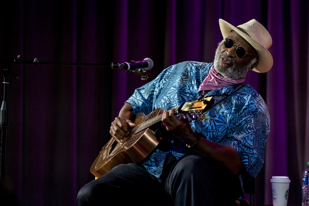 A world-renowned American blues singer-songwriter, Taj Mahal was born Henry St. Claire Frederick Jr. on May 17th, 1942. in Harlem, New York. His impact and influence in blues… and in music generally… is undeniable. Since releasing his debut album for Columbia in 1968, Taj Mahal has not only preserved but also reshaped what traditional acoustic blues is… and could be… all about. By incorporating innumerable facets of styles from around the world like calypso, reggae, gospel and finding inspiration from the Pacific and West African musical styles, his storied repertoire can really be viewed as a history of music through the eyes of a bluesman. On June 17th, 2022, decided to indulge a small audience at the Grammy Museum with some personal stories from that history.