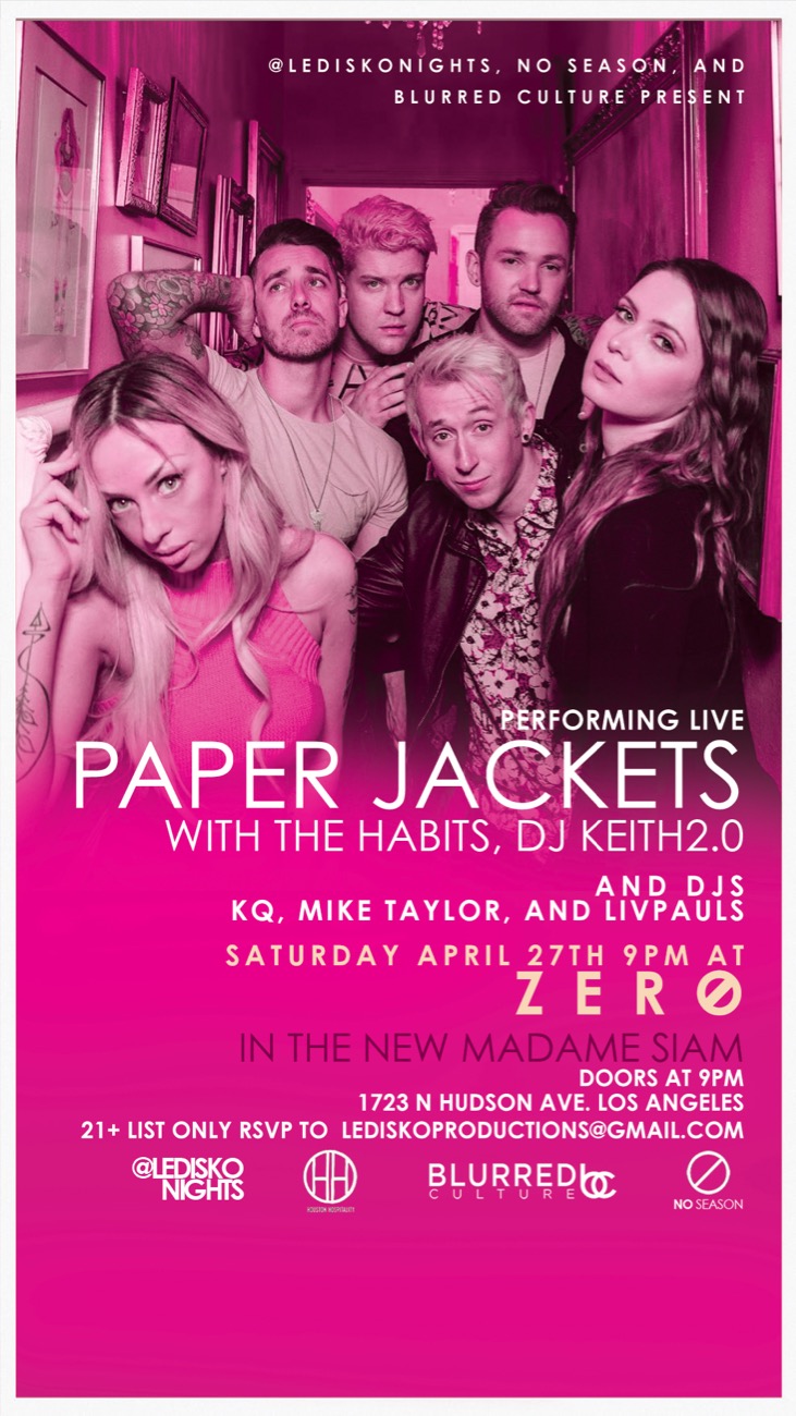 LOS ANGELES, CA- Paper Jackets are a Los Angeles-based sextet of James Mason (lead vocals), Emily Dickinson (keys), Jonny Vesely (guitar), Miles Franco (bass), Aimee Proal (vocals) and David Allen (drums). Their brand of synthpop is high energy and anthemic and Blurred Culture is super chuffed to have them take the stage for our showcase at Madame Siam tomorrow night in Hollywood.