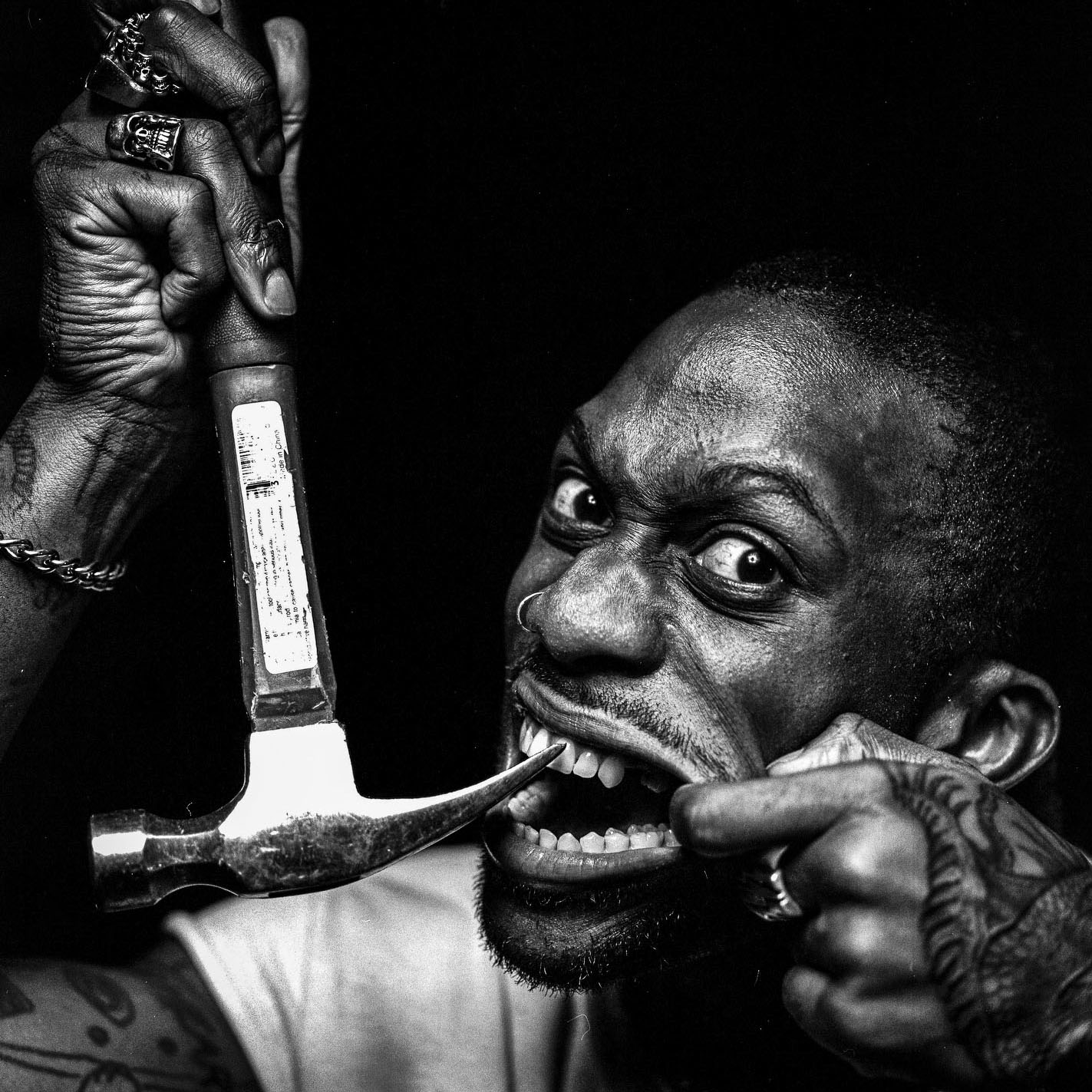 “Eaddy was something like the 100th musician I had photographed in a week and in anticipation of running out of ideas for poses I had spent that morning rallying around my house picking up random items that could be used to make a picture. I found this hammer in my shed and thought it could make a cool prop somehow. When Eaddy came in we talked about the primal fear of having teeth smashed out, like falling over on rocks or, worse, a mindless violent attack. Eaddy immediately went for the claw hammer and struck this pose. One photograph and I knew it was a banger. That terror in his eyes ain’t for show: Eaddy is 100% about everything he does and its then that you have to realize you’re dealing with a real OG punk. This photograph is cover material for the Sh!tshow zine for sure! Shot on 120 medium format.”
