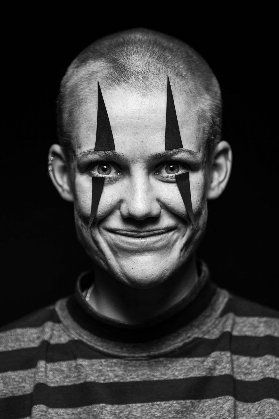 “Gabby might just be one of the most photographed people in this project, having been in front of the camera countless times in the name of music and art and fashion, and seems to know exactly what she wants. Gabby turned up to shoot with these slivers of black cardboard and glued them on her face, instantly creating this brilliant psychotic clown visage. Gabby’s striking look and fierce demeanor is both truth and performance – as with her music – and as her friend I also recognize a person of great empathy, kindness and fragility. There’s an immense human beauty in being all these things at once, and I think that beauty shows in this photograph.”