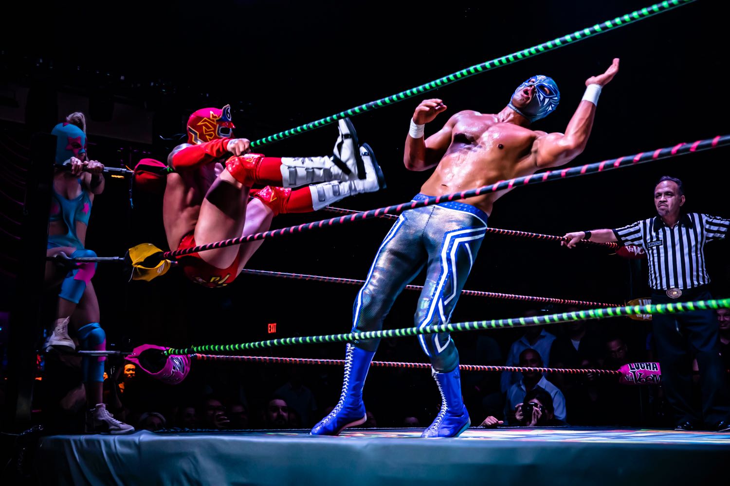 The opening matches were new luchadores Sismo and Flying Fox, and they nearly who brought the whole house down when they took on the Sexi Mexis. It was an action-packed start that got the room’s adrelanline pumping. The match had high flying action off the turnbuckles, drama, and abs … oh yeah … abs for days. It constantly amazes me how easy it is to get caught up in the silliness, the costumes, the commentators, and the showboating, all of which is wildly entertaining, but what we came here for was the wrestling and when that- the absolute spectacle- comes out, the perfectly timed stunts astound and leave one gobsmacked.