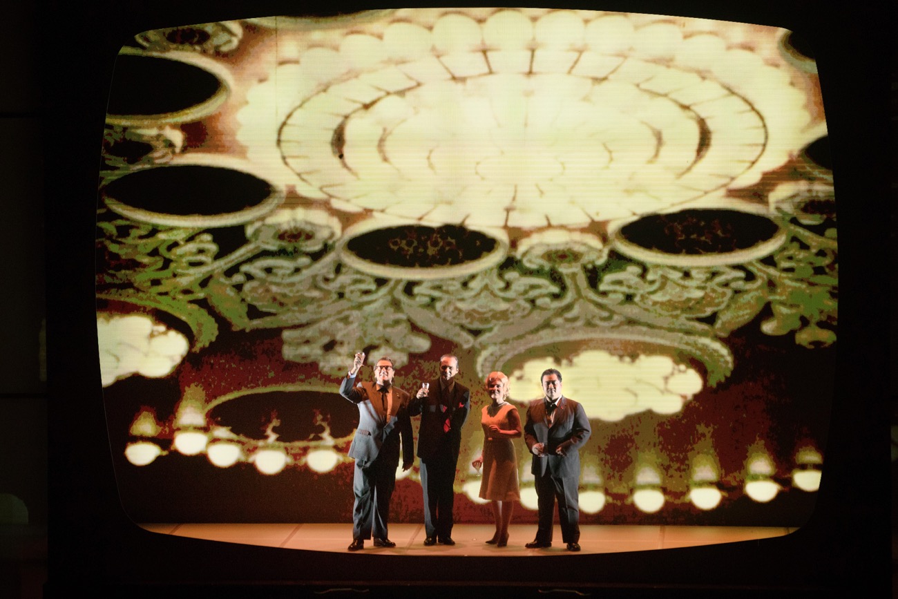 However, any attention-related deficiencies were completely and totally compensated for by the show’s ingenious staging. Taking some apparent cues from Orson Welles’ famous Caesar, Nixon’s stage is sparse and unobtrusive by design; aside from a few black risers and stairs, the stage could pass for blank – aside from the giant television looming over the stage, that is. At its heart, Nixon in China is “about” the optics of Nixon’s visit more than it’s “about” the visit’s actual events – how the image was constructed to evoke American power, or women’s roles, or any of a number of other issues. The giant television serves – used sometimes to project newsreel footage onto, elsewhere to act as a transparent surface through which characters can project their motivations – as a line of demarcation on the stage; characters go back and forth across it depending on whether they’re “on TV” or merely on the actual stage of the show. Respecting the dividing line requires extensive-yet-invisible choreography (which the cast, crew, and choir all nail flawlessly), but the elegance with which these characters move between the show’s various planes of reality is impressive enough to make you gasp.