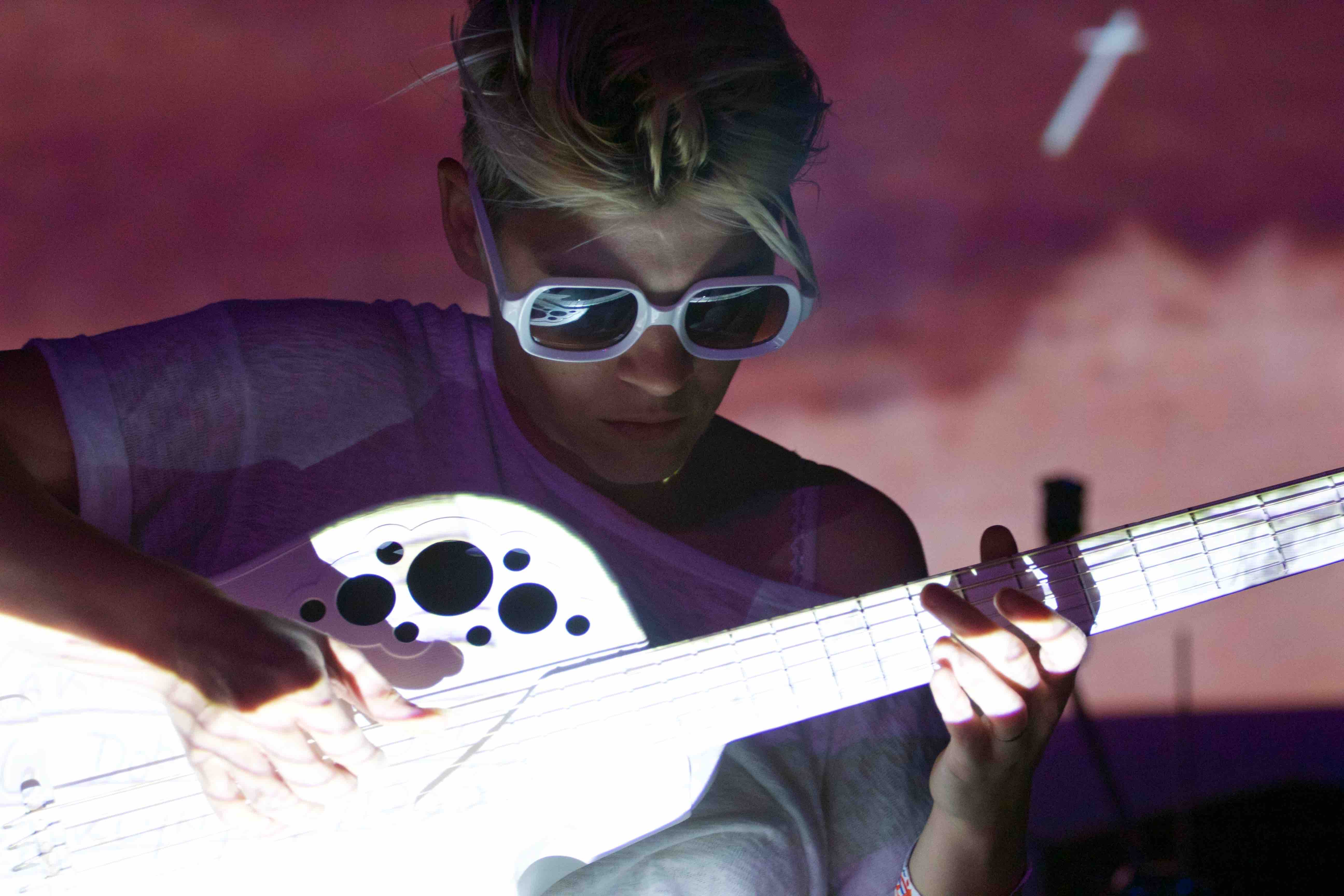 Kaki King is an American guitarist and composer known for her percussive and jazz-tinged melodies, energetic live show which utilizes a synchronized multimedia visual presentation that “performs”, even on her custom made white guitar, as she plays. The visual and auditory experience has wowed critics, and I was very excited to experience the performance myself. I was equally impressed that her multimedia presentation was 100% powered by the days blazing sun (go solar energy!).