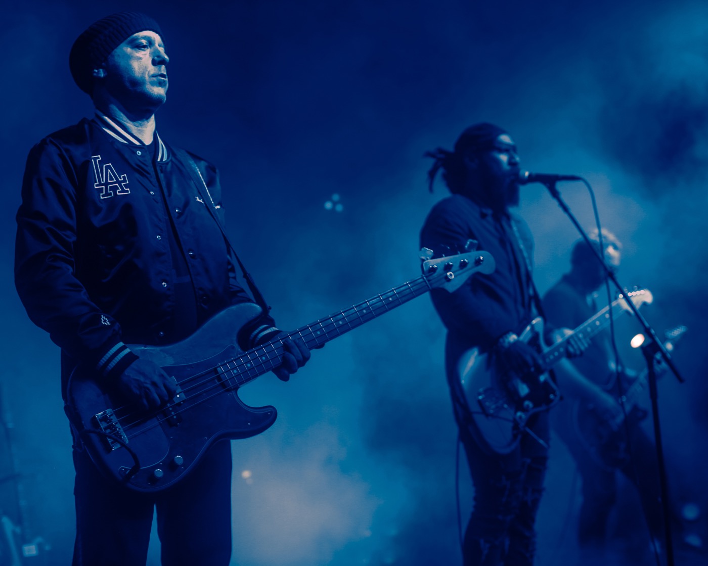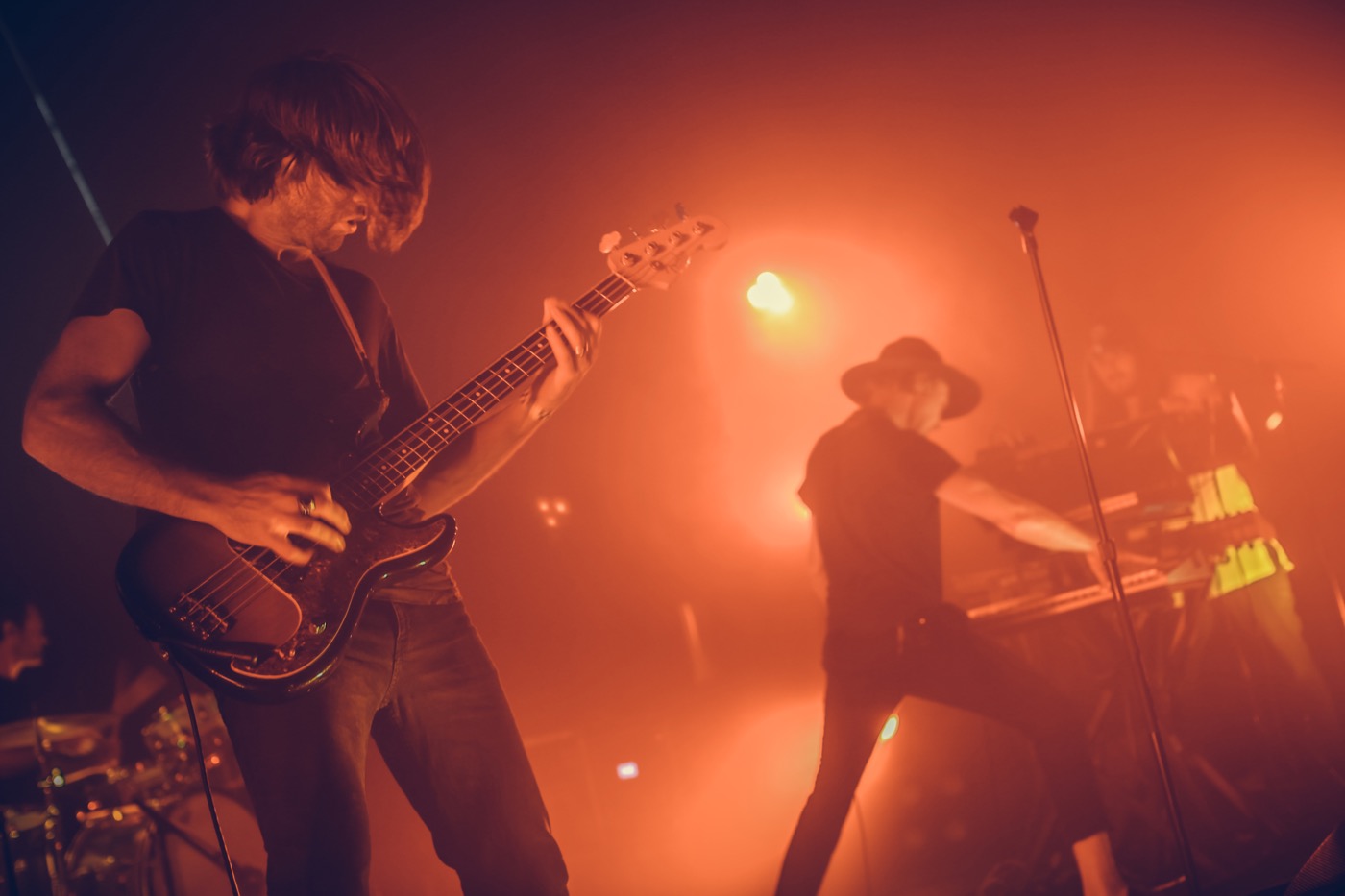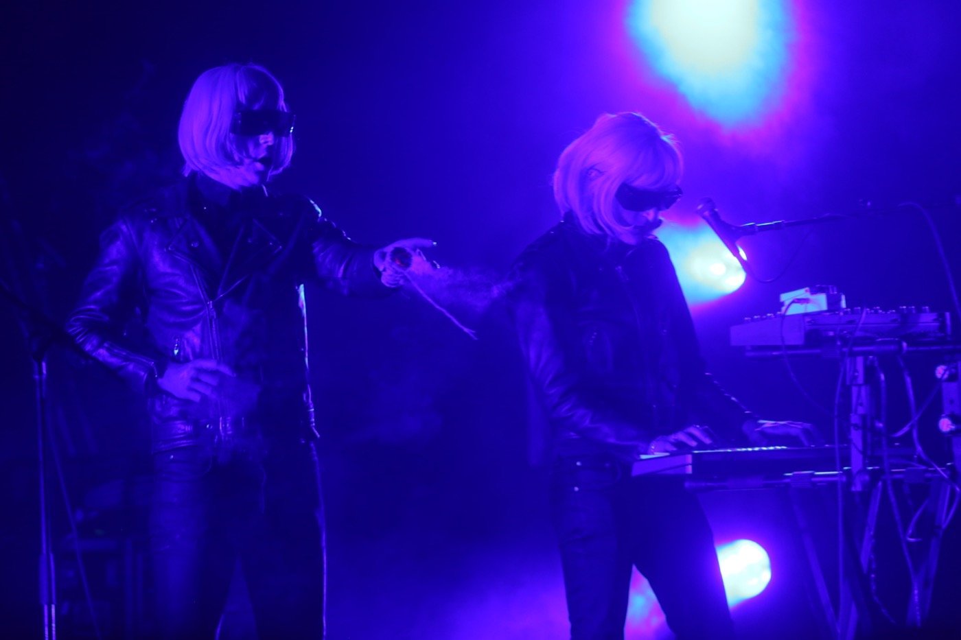 As if falling into a dark ocean, I make my way through a sea of shadows. An ethereal wave of sounds and colors guide me past the crest of the flood and into the press area of the main stage. Two apparitions dressed in leather, draped in white wigs approach their instruments and bless their surroundings by lighting sage. The smoke from the herbs and pyrotechnics float through the air as 80s synth pads and echo-drenched guitars pulse through the speakers. Drab Majesty’s set was appropriate for the setting; the moody soundscapes were like 2 specters haunting the old building with sullen lullaby’s.