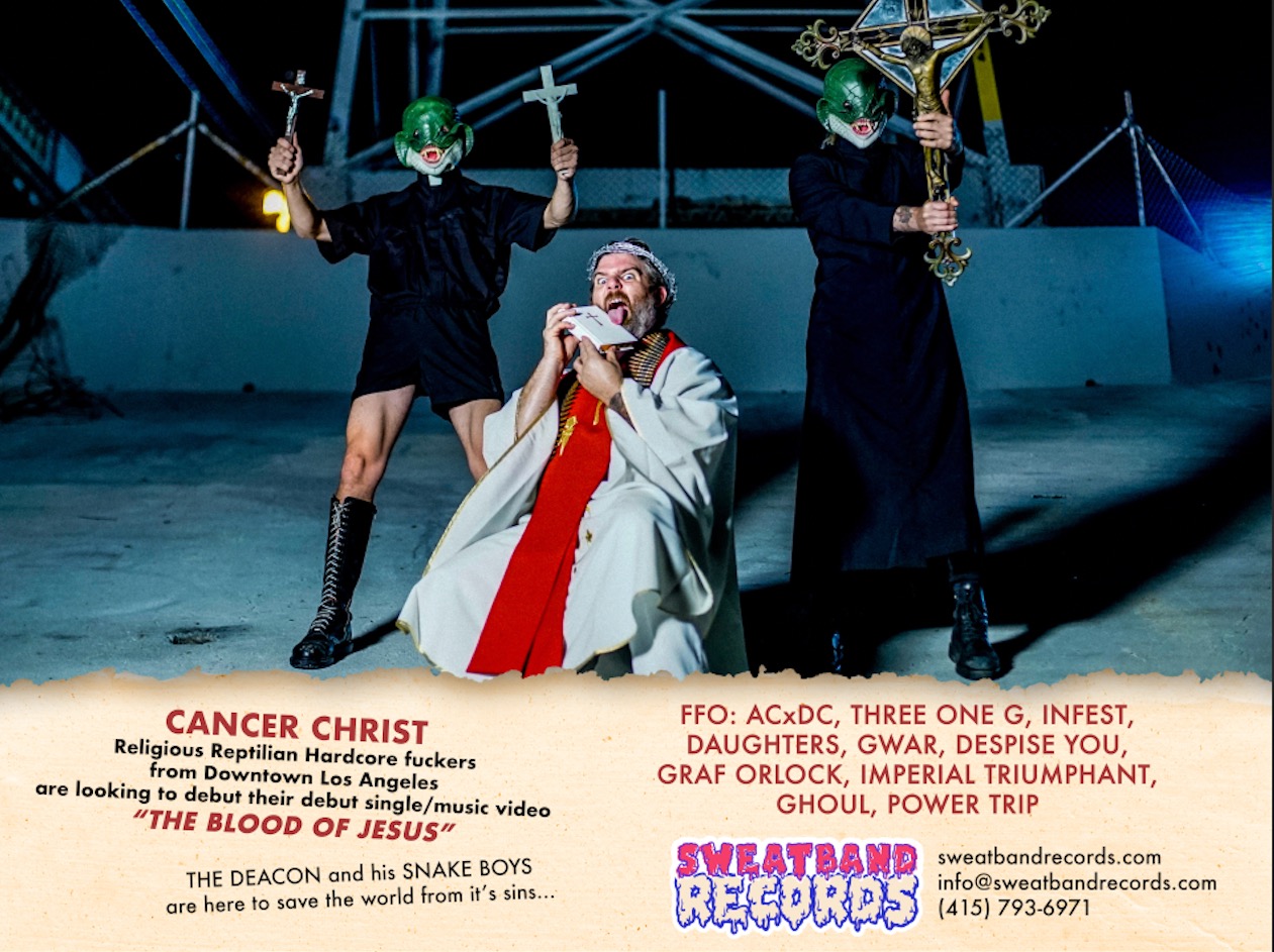 Anthony is not only documenting the lifestyle, but he’s now and now entrenched in it as he has added “lead singer” to his resume, fronting the new “REPTILIAN-CHRIST-CORE“ band CANCER CHRIST. Accompanied by his anonymous “Snake Boys”, Cancer Christ debuted with first ever single/music video for the thrashing “The Blood Of Christ”. It’s only a minute and a half, but it is a minute and a half of unfettered aggression, and as Anthony wails, “I’ve got a secret, can you keep it,” you’re compelled … even possessed… to scream along with him.