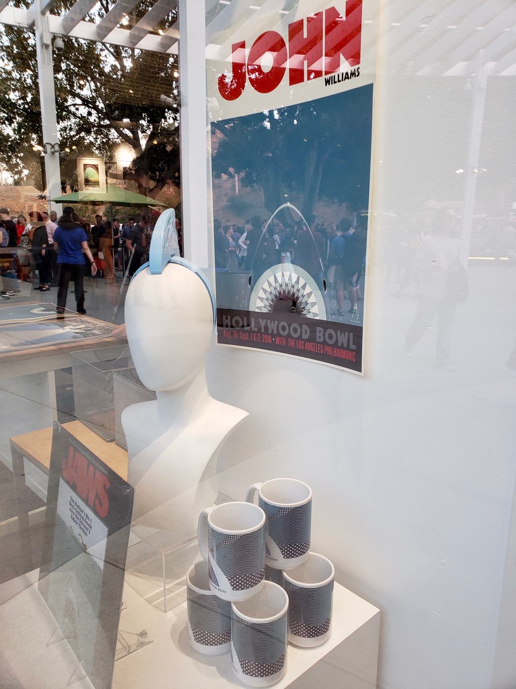 John Williams: Maestro of the Movies: 40th Anniversary Celebration! attracted legions of movie buffs in themed outfits. Hogwarts residents rubbed shoulders with jedi while passing fans in dino-themed Jurassic Park t-shirts and the occasional Indiana Jones, complete with bullwhip. The Hollywood Bowl also produced some pretty fabulous posters for this concert, with both R2-D2 and Bruce the shark’s gaping maw taking the place of the concert shell. In addition to the Jaws-themed poster, I snagged a fabulous light-up shark fin headband at the Bowl store. I happily installed my dorsal fin and swam my way through the crowds, much to my pleasure and my companion’s embarrassment.