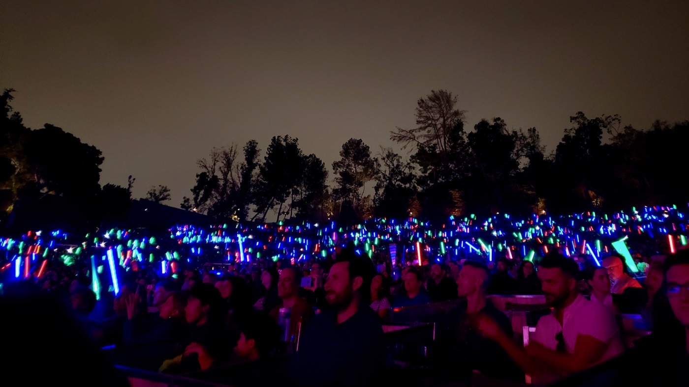 Then, the concert finally reached its apex: the finale of E.T. the Extra-Terrestrial (with film) and classic Star Wars music. The E.T. finale produced both smiles and tears, and the crowd went absolutely nuts for old-school Star Wars. I had my lightsaber at the ready (of course). One key fact I’ve learned at the Hollywood Bowl this summer is that one does not simply bring a lightsaber to a John Williams concert. It requires fierce gesticulating and periodic dueling. The sight of all the illuminated lightsabers was in fact so nerdily beautiful that the screens began to show shots of Williams with the lights waving behind him in the crowd.