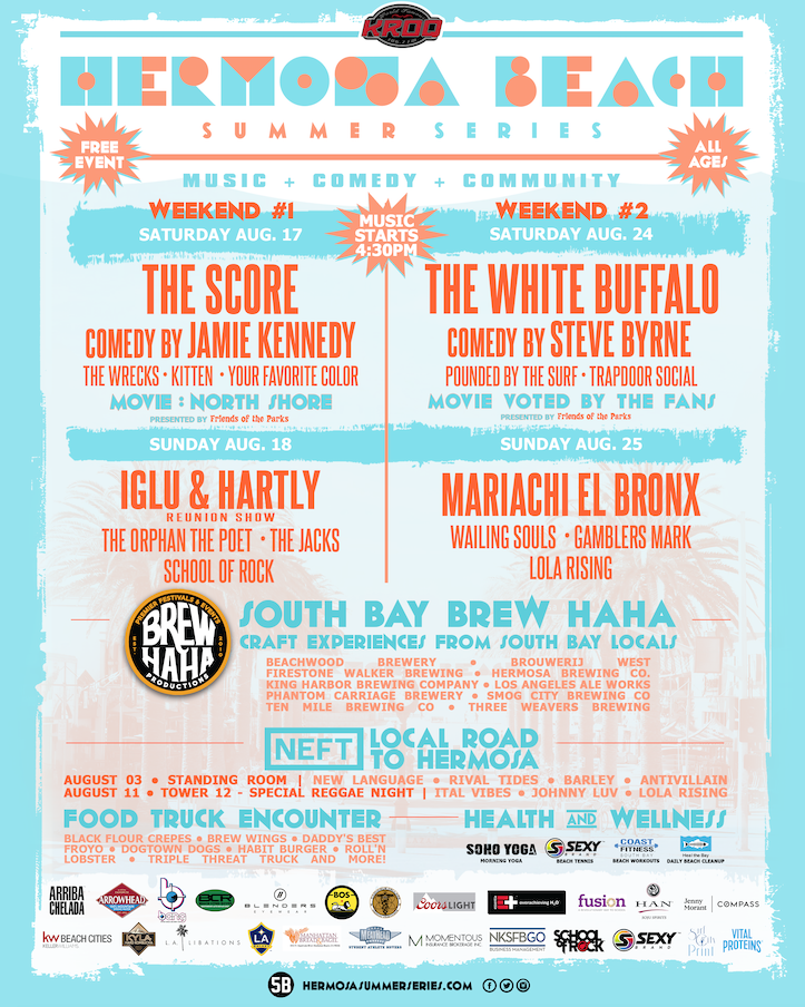 HERMOSA BEACH, CA- The 2019 Hermosa Beach Summer Series, presented by KROQ is looking pack in as much fun in the sun as it can with two amazing weekends of jam-packed fun. For the first time ever, the Hermosa Beach Summer Series is expanding to both Saturday and Sunday (Aug. 17/18 and Aug. 24/25) giving the neighborhood plenty of reasons to hit the beach for some fun in the fun. Whether it’s catching bands, laughing with comedians, watching movies on the beach or other family-friendly activities, there’ll be something for everybody!