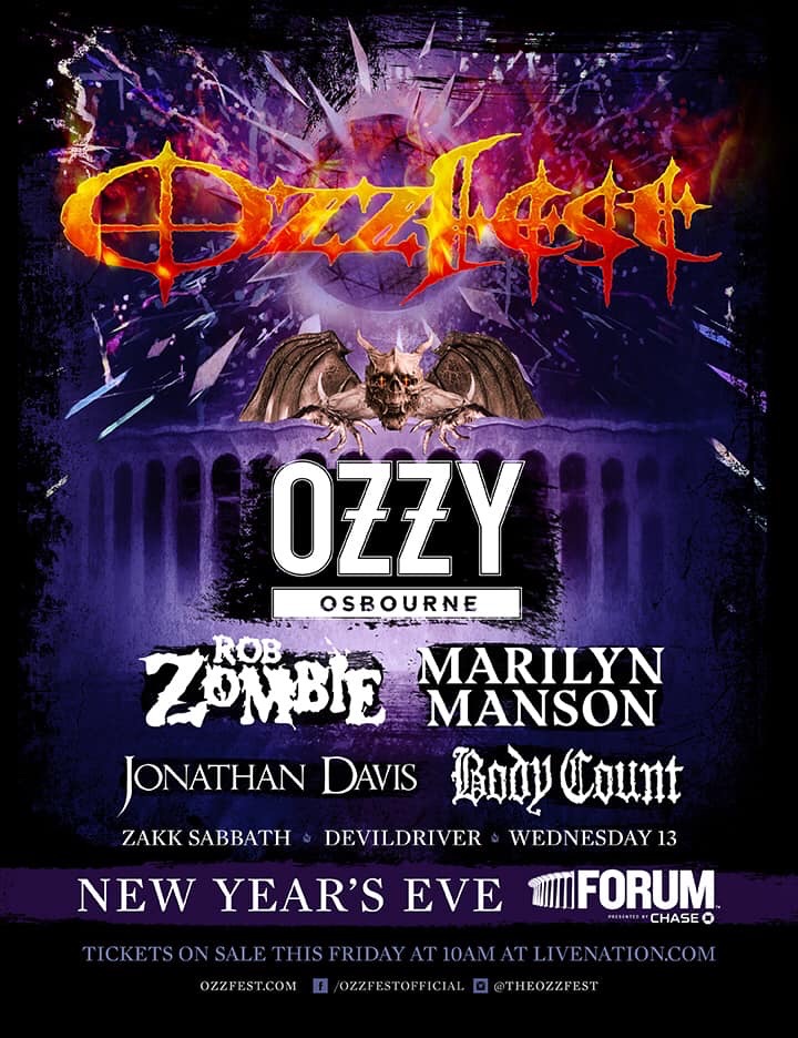 LOS ANGELES, CA- Ozzy Osbourne will be rocking in the new year in style at the Forum using his OZZFEST platform for a one-of-a-kind New Years celebration at The Forum in Los Angeles. Joining The Prince Of Darkness on the stage on the main stage will be Rob Zombie, Marilyn Manson, Jonathan Davie (of Korn) and Body Count featuring Ice-T.