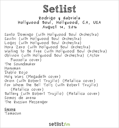 After a short intermission, Rodrigo y Gabriela joined the Hollywood Bowl Orchestra to perform a handful of specially arranged sections for the concert event. In his introduction, Rodrigo joked that the acoustic duo, because of their Mexican heritage (alluding to the negative political discourse of the times) which elicited liberal laughter from the crowd.