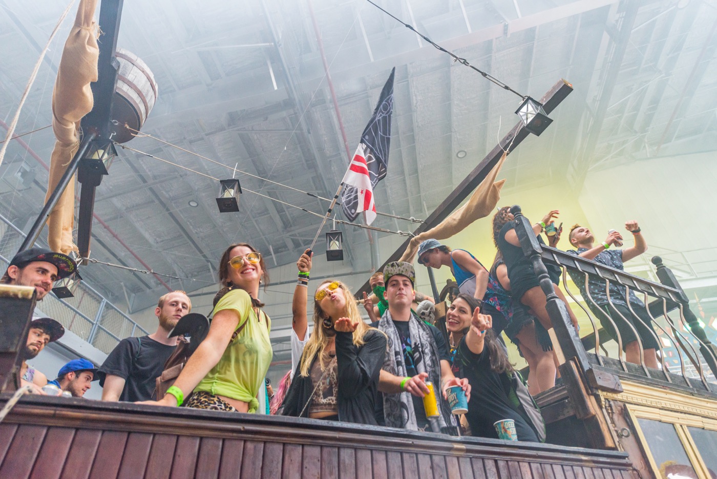 Luckily, not only could everyone fit comfortably, but being stuck indoors didn’t seem to dampen the mood at all. Characters in extravagant coordinated outfits straight out of a comic book were bouncing around, while bass-hungry swashbucklers hung off the sails of the pirate ship. Metal sculptures that people couldn’t help but climb were all over the place along with a bar and eatery. The happiness was contagious. The second floor featured a huge balcony where you can get a birds eye view or a massage (yes really).