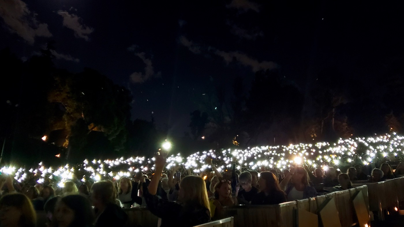 Far more effective were the moments when the audience used their cell phones to get into the mood — holding up their lights solemnly during the singing of “Edelweiss” and using the phones as searchlights during the police chase scenes. Some people in the audience had unfortunately also brought laser pointers, which they used to “scribble out” the faces of various bad guys throughout the evening. It was annoying and distracting to the point that other fans were screaming at them to stop it. I’m sure it’s difficult to isolate the people who are doing something like that, but the staff should have made a greater effort to locate and shut down whoever it was since it was crossing a line from fun interactivity into interference.