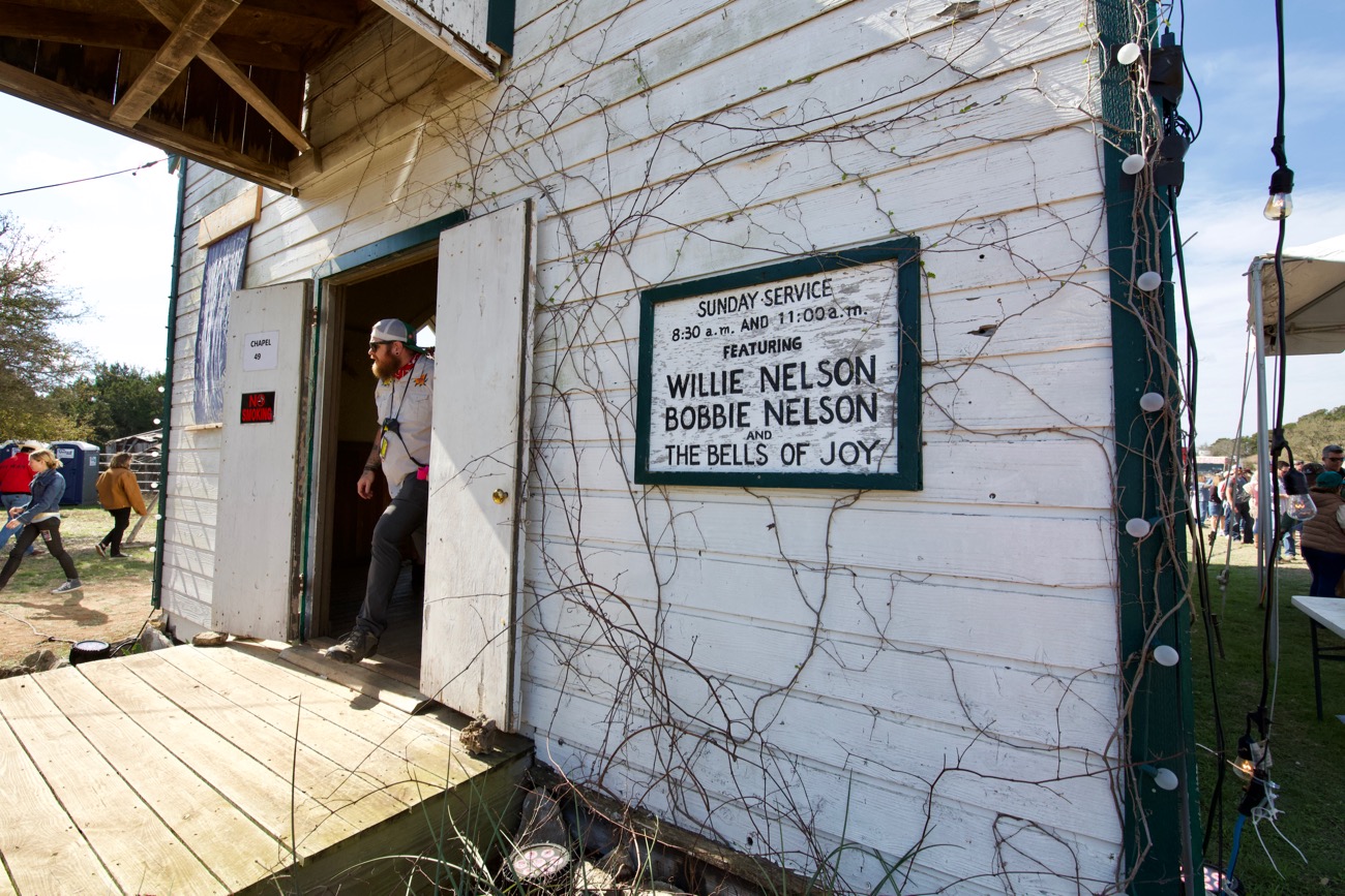 The festival itself is situated on Willie Nelson’s working ranch. As I stepped onto the festival grounds, I was literally transported into a private little city spawned from Willie’s imagination. The buildings that aligned the dirt roads were built in the mid-80s for the film adaptation of Nelson’s “Red Headed Stranger”, and each building was bustling with various types of activities. There were stables, an opry, a small chapel (more on that a little later), a tannery sponsored by Southwest Airlines’ where you could create an authentic leather custom leather luggage tag, saloons- plenty of saloons- where you could drink free Lagunitas beer, Hendrick’s Gin, Playa Real tequila and more, and even a “dispensary”, which unfortunately was closed for the day.